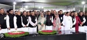 পরে আওয়ামী লীগের জ্যেষ্ঠ নেতাদের নিয়ে দলীয় সভানেত্রী শেখ হাসিনা দলের পক্ষে জাতির জনকের প্রতিকৃতিতে আরেকটি পুষ্পস্তবক অর্পণ করে শ্রদ্ধা নিবেদন করেন।