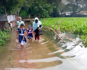 কাপ্তাই প্রতিনিধিঃ রাঙ্গামাটি কাপ্তাই হ্রদের পানি বৃদ্বির ফলে নিম্ন অঞ্চলের অনেক বসতঘর পানির নিচে নিম্নজিত। এবং চলাচলের একমাত্র সড়ক ও ব্রীজ ডুবে যাওয়ার ফলে স্কুল,কলেজ ও মাদ্রসা শিক্ষার্থীদের নিয়ে আতঙ্ক বেড়েছে অভিভাবকদের মাঝে। গত কয়েক দিনের ভারী বৃষ্টিপাতের ফলে হ্রদের পানি অতিমাত্রায় বৃদ্বি পেয়েছ। ফলে কাপ্তাই হ্রদের পাশে বসবাসকারীদের বাসতঘর পানির নিচে ডুবে গেছে। বসবাসকারীরা আশ্রয়ের জন্য উচু এলাকায় বসবাস করছে। হ্রদ,মানুষ ও বাঁধ রক্ষায় কর্ণফুলী পানি বিদ্যুৎকেন্দ্রদের কর্তৃপক্ষ গত শনিবার (২৪আগস্ট)হতে ৬ইঞ্চি ও ৪ইঞ্চি করে পানি ছেড়ে দিচ্ছে। যা পাশ্ববর্তী কর্ণফুলী নদীতে নিষ্কাশন হচ্ছে। এদিকে কাপ্তাই জাকির হোসেন স্ মিল হতে নতুন বাজার যাওয়ার একমাত্র সড়ক ও ব্রীজটি পানির নিচে ডুবে গেছে। ডুবে যাওয়ার ফলে স্কুল,কলেজ,মাদরাসা ও তিতুমীর একাডেমীর ছোট,ছোট কোমলমতি শিক্ষার্থীরা কোমর ও হাঁটুর সমান পানি ডিঙিয়ে পাঠশালায় যাচ্ছে। এতে করে অভিভাবকদের মাঝে আতংক দেখা দিয়েছে। স্কুল শিক্ষার্থী বাদশা,হাসান, তিতুমীর শিক্ষার্থী ফারিয়া ফারজানা সুপ্তি,হানজানা জানান পানি বৃদ্বির ফলে স্কুলের একমাত্র সড়ক ডুবে যাওয়ায় আমরা ভয়ে স্কুলে যাচ্ছি। অভিভাবক হাছিনা আলম,হালিমা এরা জানান আমরা শিশুদের ভয়ে স্কুলে পাঠাচ্ছি। কখন পানিতে পড়ে গিয়ে দুর্ঘটনা ঘটে। ইতিমধ্যে বেশ কয়েকবার স্কুলে যাতায়াতের ফলে হঠ্যাৎ পানি পড়ে গিয়ে বইখাতা,স্কুলড্রেস ভিজে গেছে। আমরা চাই হ্রদের পানি আরো কমানো হোক।