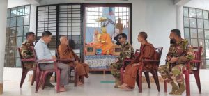 কাপ্তাই প্রতিনিধি: রাঙ্গামাটি রিজিয়নের ১০আর ই ব্যাটালিয়ন আওতাধীন বরাদম আর্মি পোষ্টে পাশে অবস্থিত ধর্মীয় নেতা সাথে শৃঙ্খলা ও নিরাপত্তা বিষয়ে বৈঠক করেছে সেনাবাহিনী। শুক্রবার (১৬আগস্ট) বিকালে ১০আর ই ব্যাটালিয়ন ‘বন ভান্তে স্মৃতি চৈত্য মন্দিরের এবং মন্দিরের সার্বিক আইনশৃঙ্খলা বিষয়ে পরিস্থতি স্বাভাবিক রাখার জন্য সেনা প্রধানের দিক নির্দেশনায় প্রদান করে। এবং ১০ আর ই ব্যাটালিয়নের অধিনায়ক লেঃকর্ণেল মুহাম্মদ সোহেল পিএসসি সার্বিক তত্বাবধানে অপ্স অফিসার ক্যাপ্টেন বখতিয়ার আহমেদ স্থানীয় মন্দির পরিচালোনা কমিটির সাথে বৈঠক করা হয়।এসময় বন ভান্তে স্মৃতি চৈত্য মন্দির কমিটির পরিচালোনার দায়িত্বে নিয়োজিত সংকিচ্চ ভিক্ষু, ও শান্ত ভিক্ষু এবং বরাদম মন্দির পরিচালোনা কমিটির সাধারন সম্পাদক অরুন জ্যোতি চাকমা এবং কমিটির অন্যান্য সদস্যরা উপস্থিত ছিলেন। ক্যাপ্টেন বখতিয়ার আহমেদ কমিটির উদ্দেশ্য বলেন মন্দির কর্তৃপক্ষ যে কোন বিষয়ে সেনাবাহিনীর সহযোগিতা চাইবেন আমরা সহযোগিতা দিতে প্রস্তুত আছি। তাছাড়া ১০ আর ই ব্যাটালিয়ন মন্দির সহ সকল ধর্মীয় প্রতিষ্ঠান নিরাপত্তার নজরে রয়েছে।