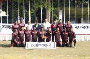 কাপ্তাই প্রতিনিধিঃ বাংলাদেশ সেনাবাহিনীর ২৪ পদাতিক ডিভিশনের আন্ত ইউনিট কাবাডি প্রতিযোগিতার ফাইনাল খেলা অটল ছাপ্পান্ন চ্যাম্পিয়ন হয়েছে। সোমবার(২০জানুয়ারি) কাপ্তাই সেনাজোন ৫৬ইং বেংগল এর আয়োজনে বিকাল ৩টায় কাপ্তাই সেনাজোন মাঠে কাবাডি ফাইনাল খেলা অনুষ্ঠিত হয়। উক্ত ফাইনাল খেলায় ১ইঞ্জিনিয়ার ব্যাটালিয়নকে ৩২-২০পয়েন্টে পরাজিত করে অটল ছাপ্পান্ন চ্যাম্পিয়ন ট্রাফি অর্জন করে। ১২জানুয়ারি চট্টগ্রাম ২৪ পদাতিক ডিভিশনের মোট ১৯ টি মেজর ইউনিট টিম প্রতিযোগিতায় অংশগ্রহণ করে। এবং পতাকা উন্মোচনের মধ্যমে কাবাডি প্রতিযোগিতার খেলা শুরু হয়। সমাপনী অনুষ্ঠানে প্রধান অতিথি ছিলেন ব্রিগেডিয়ার জেনারেল মো. শওকত ওসমান এডব্লিওসি,এএফডব্লিউসি,পিএসসি, পিএইচডি। এবং রানার আপ অর্জন করে ১ইঞ্জিনিয়ার ব্যাটালিয়ন। প্রধান অতিথি কাবাডি প্রতিযোগিতার চ্যাম্পিয়ন এবং রানার আপ দলের হাতে ট্রফি তুলে দেন। এছাড়া প্রধান অতিথি কাবাডি প্রতিযোগিতায় অংশগ্রহণকারী চ্যাম্পিয়ন এবং রানারআপসহ সকল দলকে অভিনন্দন এবং শুভেচ্ছা জানান।