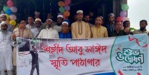 বাগেরহাট প্রতিনিধিঃ গেরহাট বৈষম্যবিরোধী ছাত্র আন্দোলনে রংপুরের আলোচিত শহীদ আবু সাঈদকে স্বরণীয় করে রাখতে” শহীদ আবু সাঈদ পাঠাগার’ নামে একটি পাঠাগার উদ্বোধন করা হয়েছে। বুধবার (২ অক্টোবর) বাগেরহাটের মোরেলগঞ্জের ৯নং বলইবুনিয়া ইউনিয়ন এর শ্রেনিখালী মুন্সির হাটে এ পাঠাগারের উদ্বোধনী অনুষ্ঠানে প্রধান অতিথি হিসেবে উপস্হিত ছিলেন জমায়েত ইসলামী নেতা অধ্যাপক শহিদুল ইসলাম , বিশেষ অতিথি হিসেবে উপস্থিত ছিলেন উপজেলা মাধ্যমিক শিক্ষা অফিসার এসএম সাইফুল ইসলাম, অধ্যক্ষ ড. মাওলানা রুহুল আমীন খান,উপজেলা আমির মাওলানা শাহাদাত হোসাইন, জামায়েত ইসলামী উপজেলা নায়েবে আমির মাস্টার মনিরুজ্জামান,খ ম লুৎফর রহমান,প্রধান শিক্ষক শহিদুল ইসলাম খান,