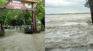 বাগেরহাট প্রতিনিধি : বিশ্বের বৃহত্তম ম্যানগ্রোভ বন সুন্দরবন বাগেরহাটের মোরেলগঞ্জ মোংলায় সুন্দরবনের নদ-নদীর পানি বিপৎসীমার ওপর দিয়ে প্রবাহিত হচ্ছে। ৪ ফুট উচ্চতার জলোচ্ছ্বাসে প্লাবিত হচ্ছে উপকূল। এরমধ্যে সুন্দরবন দুই ফুট উচ্চার পানিতে তলিয়ে গেছে। বনের ভেতরে নিম্নাঞ্চলে পানির চাপ আরো বেশি। গোটা সুন্দরবনই স্থান বিশেষ ২-৪ ফুট উচ্চতার জলোচ্ছ্বাসে প্লাবিত। তবে বন্যপ্রাণীর কোনো ক্ষয়ক্ষতি এখনো চোখে পড়েনি।
