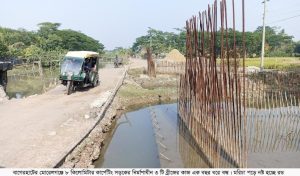 বাগেরহাট প্রতিনিধিঃ বাগেরহাটের মোরেলগঞ্জেতেলিগাতি ইউনিয়নে ৮কিলোমিটার কার্পেটিং সড়কের ৩ টি ব্রীজ নির্মাণের কাজ এক বছর ধরে বন্ধ রয়েছে। যার ফলে নির্মাণাধীন কাজে রডে ধরেছে মরিচা। ঠিকাদারের হদিস মিলছে না। স্থানীয় জনসাধারনের দাবি ব্রীজ ও কার্পেটিং রাস্তার কাজ দ্রæত শেষ করার।