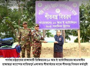 কাপ্তাই প্রতিনিধিঃ রাঙ্গামাটি রিজিয়নের ১০আর ই ব্যাটালিয়ন কর্তৃক অসহায় পরিবারের মাঝে শীতবস্ত্র বিতরণ করছ। বৃহস্পতিবার (২জানুয়ারী) ১০আর ই ব্যাটালিয়নের আওতাধীন জীবতলী ইউনিয়নের কৌশল্যা পাড়া এলাকায় শীতার্ত গরীবদের মাঝে শীতবস্ত্র বিতরণ কর।